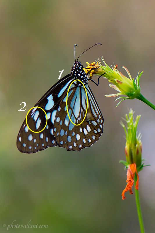 The blue markings are noticeably thicker on T.limniace. Especially, look at the big ‘V’ shaped marking on the under hind wing which starts from the base. The branches/lines of this ‘V’ is thicker, making the cutting in the middle narrower. Whereas in the other, blue lines are narrower. This is marked as ‘1’ in the below picture.