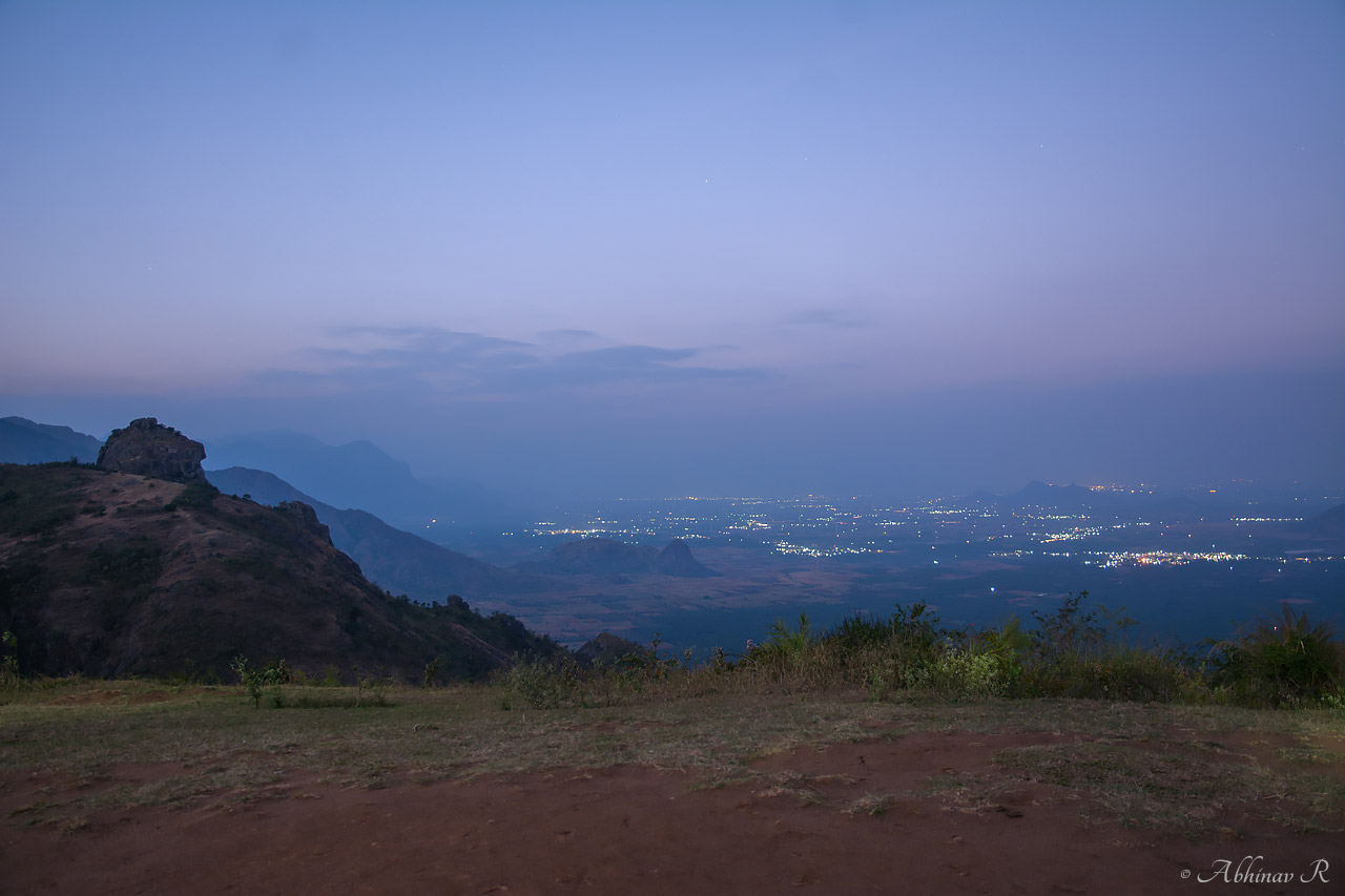 Cumbum town viewed from the statue hill at dusk.